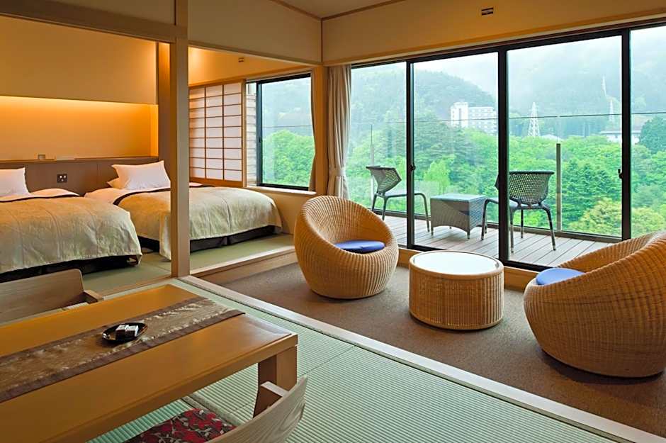 Large rooms featuring an outdoor seating area overlooking Kinugawa River. It has floor-to-ceiling windows, Western beds and a tatami seating area. Amenities include a flat-screen TV, a DVD player and a humidifier, while complimentary tea and Japanese confectionary are provided. Yukata robes and nightwear are furnished. Free Wi-Fi is available.